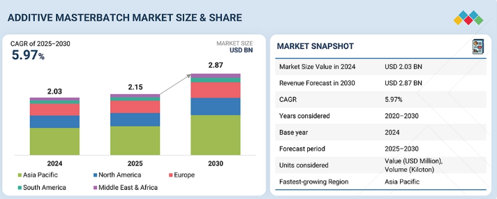 添加剤マスターバッチ市場は、金額ベースで2025年の21.5億米ドルから2030年には年平均成長率5.97%で28.7億米ドルに成長すると予測されています。添加剤マスターバッチ市場の主な促進要因の1つは、耐紫外線性、難燃性、抗菌性、色安定性などの高度な特性を備えた高品質のプラスチック製品の需要が高まっていることです。また、自動車、包装、電子機器、建築・建設などの産業でプラスチックの使用が増加しているため、製造企業は高度な添加剤マスターバッチを使用して製品の寿命と機能性を向上させる効果的かつ効率的な方法を採用しており、需要を牽引しています。