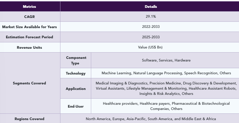 市場を形成する主な動向としては、AIを搭載した診断ツールの普及、臨床試験や医薬品開発におけるAIの統合、管理自動化のためのAIの採用、イノベーションと実装を加速するための政府・民間両部門からの投資の拡大などが挙げられます。