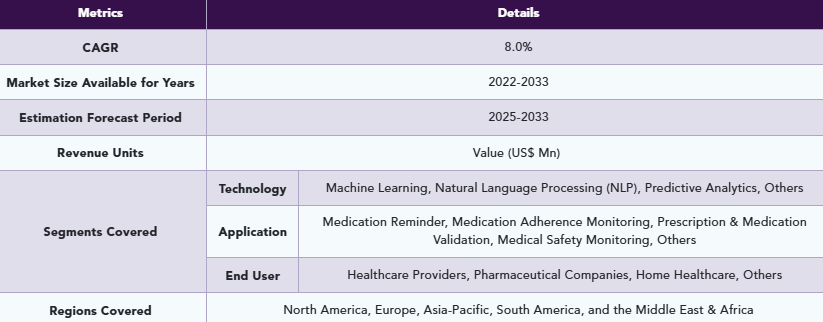 投薬管理におけるAIの世界市場は、2024年に5億4,961万米ドルに達し、2033年には10億1,826万米ドルに達すると予測され、予測期間2025年から2033年にかけて年平均成長率8.0%で成長すると予測されています。