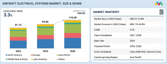 航空機電気システム市場は、2025年の940億6,000万米ドルから2030年までに1,104億米ドルへ成長し、2025年から2030年までの年間平均成長率(CAGR)は3.3%と予測されている。航空機電気システム市場は近年著しい成長を遂げている。この拡大は主に、モアレジック航空機(MEA)および全電気式航空機(AEA)アーキテクチャへの移行が進むことに加え、機体数の増加と航空機の近代化計画が相まって推進されている。パワーエレクトロニクスとエネルギー分配技術における進歩が、航空分野における先進電気システムの採用を加速させている。
