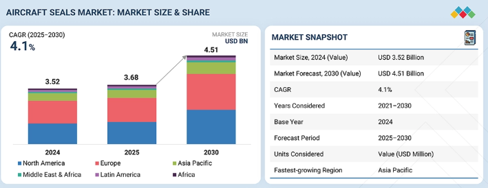 世界の航空機用シール市場規模は2024年に35億2,000万米ドルと評価された。予測期間中、年平均成長率(CAGR)4.1%で推移し、2025年の36億8,000万米ドルから2030年には45億1,000万米ドルに達すると見込まれる。