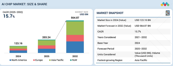 AIチップ市場は、2025年の2,032億4,000万米ドルから2032年までに5,648億7,000万米ドルに達すると予測されており、2025年から2032年までの年間平均成長率(CAGR)は15.7%となる見込みです。AIチップ市場の成長は、大規模なデータ処理とリアルタイム分析に対する差し迫ったニーズによって牽引されています。