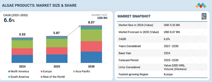 藻類製品市場は、2025年の58億7,000万米ドルから2030年までに80億7,000万米ドルに達すると予測されており、2025年から2030年までの年間平均成長率(CAGR)は6.6%となる見込みです。市場の成長は、持続可能なタンパク質製品への需要増加、オメガ3の健康効果に関する消費者意識の高まり、および化粧品・パーソナルケア業界からの需要によって牽引されています。