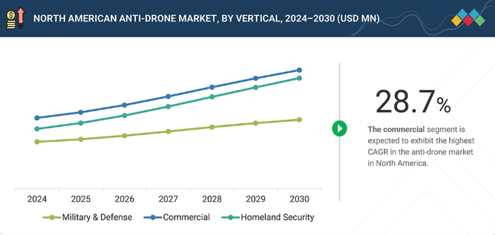 北米アンチドローン市場、業種別(市場規模、数量、2030年までの予測-10億米ドル)