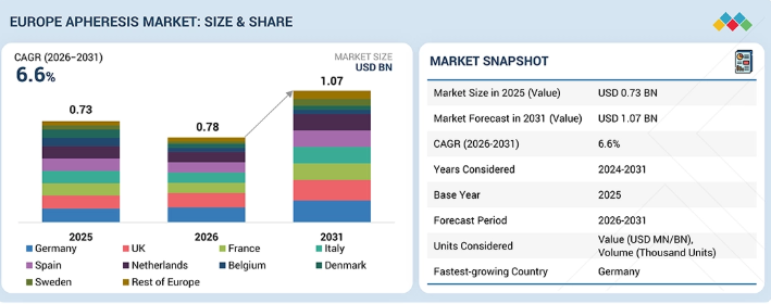 欧州アフェレーシス市場は、2025年に7億3000万米ドルと評価され、2026年には7億8000万米ドルに達し、2026年から2031年にかけて6.6%の堅調なCAGRで成長し、期間終了時には10億7000万米ドルに達すると予測されている。欧州アフェレーシス市場の成長は主に、血液成分への需要増加、強力な血小板アフェレーシス基盤の存在、次世代アフェレーシス装置の普及、医療エコシステムへの継続的な投資によって牽引されている。