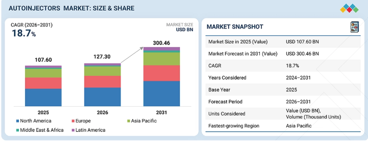 世界のオートインジェクター市場は、2025年に1,076億米ドルと評価され、2026年には1,273億米ドルに達しました。2026年から2031年にかけては堅調な年平均成長率(CAGR)18.7%で拡大し、同期間の終わりには3,004億6,000万米ドルに達すると予測されています。この市場は、糖尿病、多発性硬化症、関節炎などの慢性疾患や自己免疫疾患の有病率の上昇、および世界的な規制当局による承認の増加により、著しい成長が見込まれています。さらに、長期的な注射療法を必要とする慢性疾患を中心に、自己投与型医薬品の採用が増加しており、政府による支援も得ています。さらに、手頃な価格でオートインジェクターの普及を促進する有利な償還政策が、オートインジェクターの需要を後押ししています。