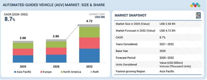 世界の無人搬送車(AGV)市場は、2025年に26億8000万米ドル規模に達すると予測され、2032年までに47億2000万米ドルに達し、年平均成長率(CAGR)8.7%を記録すると見込まれている。世界的な自動搬送車(AGV)市場の成長は、製造、倉庫、物流、電子商取引業界における自動化の普及拡大によって牽引されている。人件費の上昇、効率的な資材運搬の必要性、スマート工場や倉庫自動化への移行がAGVの導入を加速させている。ナビゲーション技術、フリート管理ソフトウェア、システム統合能力の継続的な進歩が、市場の拡大をさらに後押ししている。