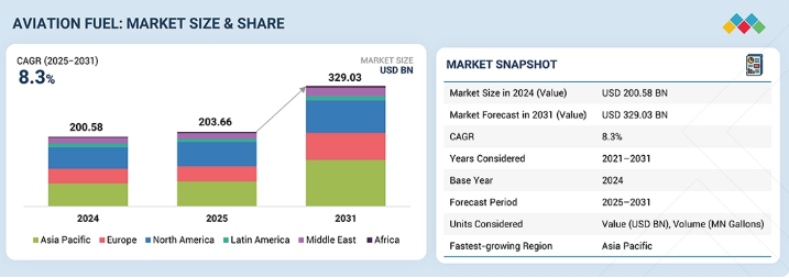 航空燃料市場は2025年に2,036億6,000万米ドルと推定され、2031年までに年平均成長率(CAGR)8.3%で3,290億3,000万米ドルに達すると予測されています。数量ベースでは、市場は2025年の921億6,000万ガロンから2031年には1,395億2,000万ガロンに成長すると見込まれています。世界的な航空旅行の増加が航空燃料産業を牽引する主要因である。各国政府は持続可能な航空燃料(SAF)の活用による炭素排出量抑制のため、航空燃料の研究開発に多額の投資を行っている。