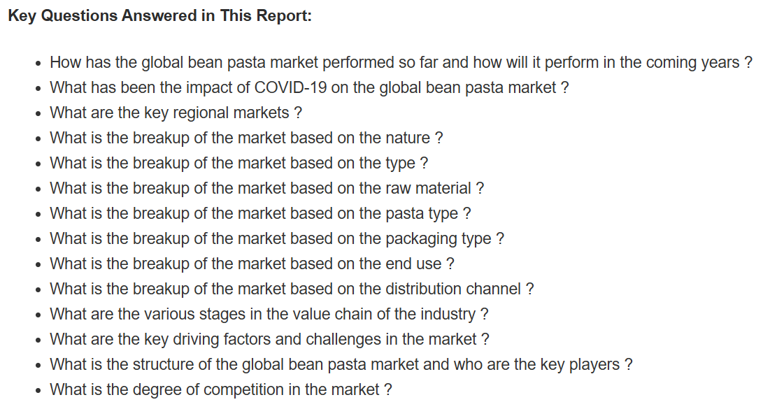 健康志向の消費者の増加が、従来の小麦パスタから豆パスタなどのより健康的な代替品へのシフトを促す主な要因となっています。 保存が容易で賞味期限の長い即席食品の需要の高まりとともに食品加工業が拡大していることも、豆パスタ市場を後押ししています。 さらに、糖尿病、肥満、グルテン不耐症などの生活習慣病の増加も市場の成長を後押ししています。グローバル化の進展と、さまざまなフレーバーの豆パスタが広く入手可能になっていることも、世界中で製品の需要を促進しています。消費者の好みの変化に伴い、多くのパスタメーカーがタンパク質が豊富でグルテンフリーの乾燥パスタを数多く発売しています。さらに、消費者の栄養需要に応えるため、主要な市場関係者がグルテンフリーのラベル表示にますます力を入れていることも、市場の成長を後押ししています。これに加えて、ソーシャルメディアマーケティング戦略や多数のフードブログ、オンラインレシピ、顧客レビューなどが広く普及していることも、ビーンパスタの需要をさらに押し上げています。しかし、2020年初頭の新型コロナウイルス(COVID-19)のパンデミックにより、複数の製造工場の一時的な閉鎖や原材料の入手不能により、ビーンパスタのサプライチェーンが混乱しました。さらに、全国的なロックダウンにより、レストラン、カフェ、フードコートなどが閉鎖されたため、外食産業からの豆パスタの需要はマイナスの影響を受けました。しかし、電子商取引プラットフォームからの豆パスタの販売増加が、その消費を促進しています。