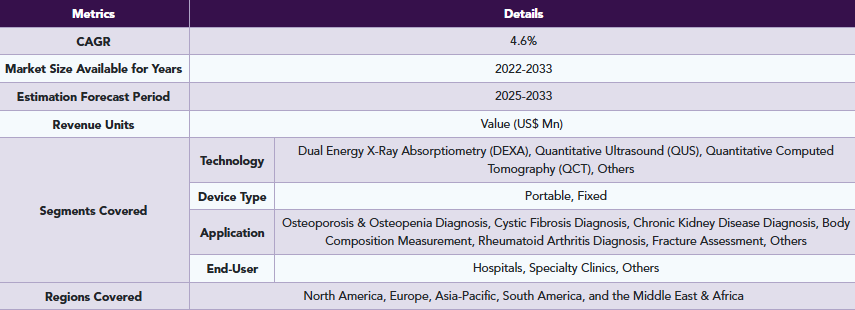 世界の骨密度測定装置市場は、技術、装置の種類、用途、エンドユーザー、および地域に基づいてセグメント化されています。
