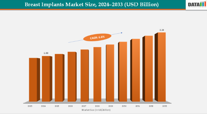 世界の乳房インプラント市場は、2024年の18億8,000万米ドルから2033年までに33億4,000万米ドルへ成長し、予測期間中に年平均成長率(CAGR)6.6%を記録すると予測されています。乳房インプラント市場は、美容目的の豊胸手術や乳房切除術後の再建手術に対する需要の高まりを背景に、コヒーシブシリコーンゲル、解剖学的デザイン、軽量インプラントなどの技術革新に支えられ、着実な成長を遂げている。