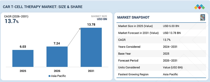 世界のCAR-T細胞療法市場は、2025年に60億3,000万米ドルと評価され、2026年には72億4,000万米ドルに達しました。2026年から2031年にかけては堅調な年平均成長率(CAGR)13.7%で拡大し、同期間の終わりには137億8,000万米ドルに達すると予測されています。世界のCAR T細胞療法市場は、急速な技術進歩に加え、大手製薬会社や資金力のあるバイオテクノロジー企業からの投資増加により成長しています。こうした変化により、製品の均一性、静脈間での信頼性、および治療施設の処理能力が向上しており、主要な血液悪性腫瘍における適応拡大や早期治療への移行に支えられ、臨床現場での採用が広まっています。しかし、市場規模の拡大は、依然として高い総費用と償還に関する摩擦によって制約されています。