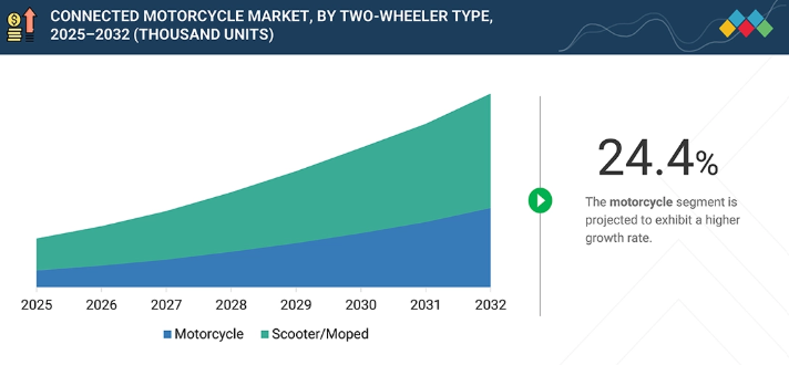 コネクテッド・モーターサイクル市場は、センサー・コストの低下、ネットワーク接続性の向上、安全規則の厳格化により、急速に成長する見込みです。これらの要因により、オートバイやスクーター/原付のOEMは、GPS追跡、クラッシュアラート、ナビゲーションなどのスマート・コネクテッド機能の追加を推進しています。