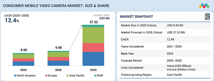 世界の消費者向けモバイルビデオカメラ市場は、2025年に85億米ドルと推定され、2035年までに273億2,000万米ドルに達すると予測されています。2025年から2035年にかけて年平均成長率(CAGR)12.4%で成長する見込みです。市場成長は、クリエイター経済の急速な拡大、ショート動画やライブ動画コンテンツの消費増加、スマートフォンを超えた高品質で携帯可能な動画撮影ソリューションへの需要増大によって牽引されています。ビデオブログ、ソーシャルメディア、スポーツ・アドベンチャー、教育、イベント取材などでの採用拡大により、アクションカメラ、ハンドヘルドポケット/ジンバルカメラ、360°カメラの出荷台数が加速しています。手ぶれ補正技術、AI搭載撮影モード、低照度性能、シームレスなモバイル接続性といった技術的進歩により、ユーザー体験が向上し、一般ユーザーやプロシューマー層における普及が拡大しております。オンライン販売チャネルへの移行とアジア太平洋地域からの強い需要が、主要地域における持続的な市場拡大をさらに後押ししております。