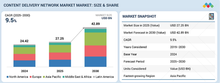 世界のCDN市場は2025年に272億5000万米ドルに達すると推定され、2030年までに428億9000万米ドルに成長し、予測期間中に年平均成長率(CAGR)9.5%を記録すると予測されている。デジタルサービスがパフォーマンスに敏感になり、地理的に分散するにつれて、市場は進化している。コンテンツ配信はもはや、少数の集中型データセンターを通じて主に処理されるものではない。代わりに、アプリケーション、メディアプラットフォーム、企業システムは、地域に分散したクラウドインフラストラクチャとエッジロケーションを通じてますますサポートされるようになっている。アクセスパターンが広がるにつれ、特にビデオストリーミング、eコマースプラットフォーム、SaaSアプリケーションにおいて、ロード時間、サービスの可用性、配信の一貫性に対する期待がより明確になっている。