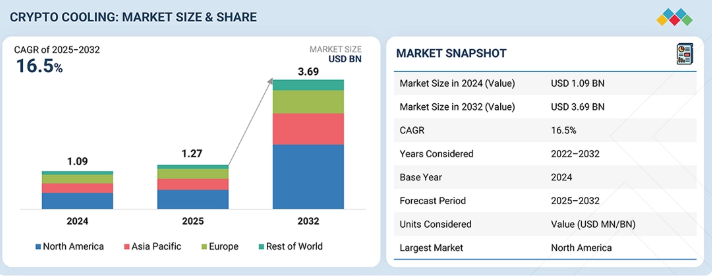 世界の暗号資産マイニング用冷却市場は、2025年の12億7,000万米ドルから2032年までに36億9,000万米ドルへと成長し、予測期間中の年平均成長率(CAGR)は16.5%になると見込まれています。暗号資産マイニング業界が恒常的な運営へと移行し、開発のための資金が必要となるにつれ、世界の暗号資産マイニング用冷却市場は拡大しています。ハッシュレートの向上に伴うマイナー間の競争激化により、マイナーは機器を可能な限り稼働させざるを得ず、その結果、ハードウェアへの熱的ダメージが増大しています。オペレーターは、パフォーマンスの問題や機器の突然の故障を防ぐため、連続稼働期間中も機器を正常な温度で維持できる先進技術を採用した新しい冷却システムを導入しています。現在、マイニング事業は世界中の複数の場所で行われているため、マイニング業界には、変動する温度条件に効率的に対処できる熱管理システムが求められています。エネルギー最適化に焦点を当てた現在のマイニング効率化戦略のトレンドは好影響をもたらしており、世界的な暗号資産冷却産業の拡大を後押しする新たな冷却技術の導入を促進しています。