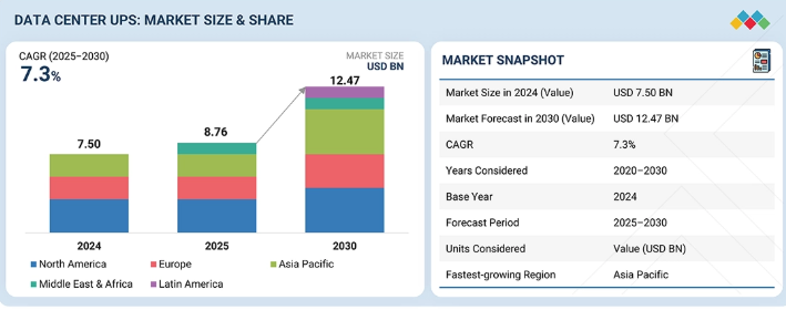 データセンターUPS市場は、2025年の87.6億米ドルから2030年には124.7億米ドルに達すると予測され、年平均成長率は7.3%です。データセンターが高密度コンピューティング、AI推論、低遅延ワークロードへと移行し、妥協のない電源継続性が求められるようになるにつれ、市場は強化されています。オペレータは、ダウンタイムとエネルギーの無駄を最小限に抑えるために、インテリジェントなエネルギー貯蔵、グリッドインタラクティブ機能、および予測メンテナンスを特徴とする高度なUPSトポロジーに移行しています。リチウムイオンとモジュール式UPSシステムは戦略的資産になりつつあり、より高いラック利用率と柔軟な容量拡張を可能にします。ハイパースケールとエッジ環境の融合に伴い、UPSアーキテクチャはデータセンターの信頼性、持続可能性、運用インテリジェンスを支えるダイナミックなエネルギー管理システムへと進化しています。
