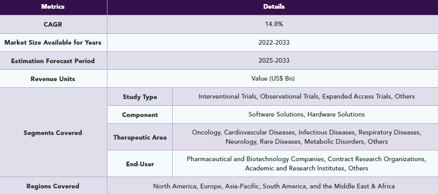 分散型臨床試験市場規模は2024年に86.8億米ドルに達し、2033年には299.0億米ドルに達すると予測され、2025年から2033年の予測期間中に14.8%の年平均成長率で成長すると予測されます。