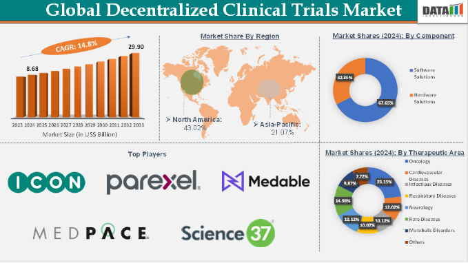 分散型臨床試験市場の上位企業には、ICON plc、Parexel International Corporation、Laboratory Corporation of America Holdings、Medpace, Inc.、Science 37、THREAD, Inc.、Curebase、Castor、IQVIA Inc.、Medable Inc.などがあります。