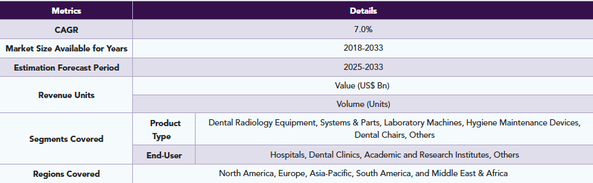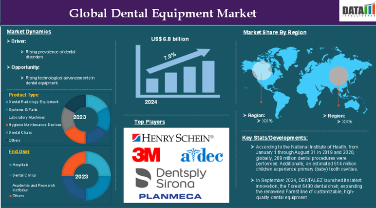 DataM Intelligenceのレポートによると、世界の歯科用機器市場は2024年に68億米ドルに達し、2033年までに124億米ドルに達すると予想されています。2025年から2033年の予測期間において、年平均成長率(CAGR)7.0%で成長すると見込まれています。