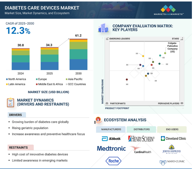 2024年に308億米ドルと評価された世界の糖尿病治療機器市場は、2025年には343億米ドルとなり、2025年から2030年にかけて年平均成長率12.3%で堅調に推移し、期間終了時には612億米ドルに達すると予測されています。ライフスタイルの変化、食習慣、肥満率の上昇に起因する糖尿病患者の世界的な増加が、糖尿病ケア機器の需要を大幅に押し上げています。老年人口は糖尿病に罹患しやすいため、これらの機器に対する需要が高まっています。予防的な健康プログラムやスクリーニングの取り組みは、糖尿病の早期診断と管理の重要性を強調しています。スマートフォンとの統合、低侵襲性、埋め込み型センサーなど、持続血糖モニタリング機器の技術的進歩は、糖尿病治療をより正確で患者に優しいものにしています。しかし、低所得層におけるデバイスのコストや農村部における認知度の低さといった要因によって、受け入れが制限される可能性があります。それでも、継続的な技術革新と予防対策への世界的な注目により、市場の成長が見込まれています。