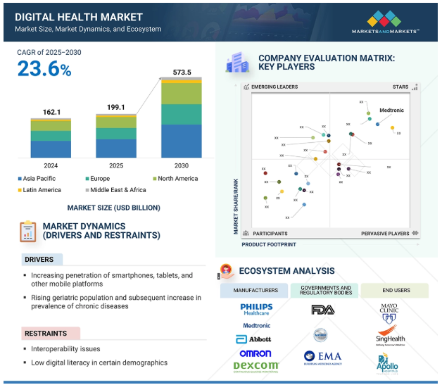 2024年に1,621億米ドルと評価された世界のデジタルヘルス市場は、2025年には1,991億米ドルとなり、2025年から2030年にかけて年平均成長率23.6%で堅調に推移し、期間終了時には5,735億米ドルに達すると予測されています。デジタルヘルス市場は、先進地域と新興地域の両方において、アクセスしやすく、個別化され、テクノロジーを活用したケアに対するニーズの高まりに後押しされ、大きな牽引力となっています。AI、ウェアラブルセンサー、モバイルヘルスアプリケーション、遠隔モニタリングの革新により、リアルタイムの健康追跡、早期診断、より迅速なケア提供が可能になりつつあります。これらのツールが融合することで、患者と医療システムとの関わり方が変化し、より予防的でデータ主導の継続的な医療が実現します。