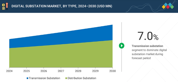 デジタル変電所市場は、送電変電所と配電変電所に区分される。送電変電所が市場を支配しており、大規模な送電網近代化、再生可能エネルギー統合、高電圧ネットワーク相互接続によるシステム効率・信頼性向上がこれを支えています。