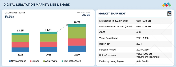 デジタル変電所市場は、2025年の144億1000万米ドルから2030年までに197億8000万米ドルに達すると予測されており、2025年から2030年までの年間平均成長率(CAGR)は6.5%となる見込みです。成長は、送配電システムの効率性、信頼性、リアルタイム制御を強化するための送電網近代化、再生可能エネルギー統合、変電所自動化の需要増加によって牽引されている。
