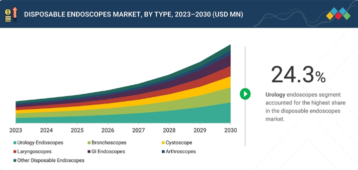 ディスポーザブル内視鏡市場において、最終顧客に影響を与える主なトレンドと混乱には、感染のない処置に対する需要の増加、HDイメージングや人間工学に基づいたデザインにおける技術的改善、低侵襲処置への移行などがあります。混乱は、規制上の課題、サプライチェーンの問題、費用対効果の高いシングルユース機器の出現に起因しており、病院や診療所は品質、効率、コストのバランスを取る必要に迫られています。さらに、患者の安全に対する意識の高まりや、ベッドサイドですぐに使える内視鏡の必要性により、世界中で購入の選択肢や手技のワークフローが変化しています。