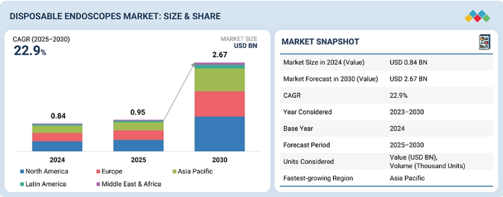 世界の使い捨て内視鏡市場は、2025年の0.95億米ドルから2030年には26.7億米ドルに達すると予測されており、予測期間中のCAGRは22.9%です。使い捨て内視鏡市場の成長は、主に、低侵襲手術の需要の増加、肺、消化器、泌尿器、整形外科の処置を必要とする慢性疾患の有病率の上昇、4K/3D可視化や蛍光イメージングなどの継続的な技術進歩が原動力となっています。しかし、高額な機器コストや厳しい規制当局の承認プロセスなどの課題もあります。