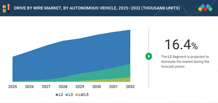 ドライブ・バイ・ワイヤ市場は、重要な車両システムにおける、ソフトウェア制御による精密な作動へのニーズの高まりにより、着実に成長しています。乗用車および商用車のOEM各社は、予測可能な応答とフェイルセーフな動作が求められる電動化、自動化、および集中型電子アーキテクチャを支援するため、ステアリング、ブレーキ、スロットル、およびシフト操作にドライブ・バイ・ワイヤを採用しています。一方、電気自動車やハイブリッド車の生産増加に加え、ADAS(先進運転支援システム)や自動運転機能の導入拡大により、電子アクチュエーションへの需要が加速しています。センサー、制御ユニット、冗長性アーキテクチャ、および車載ネットワークの進歩により、システムの信頼性と安全基準への適合性が向上しており、これにより、あらゆる車両プラットフォームにおけるドライブ・バイ・ワイヤの採用が促進され、長期的な市場成長が維持されています。