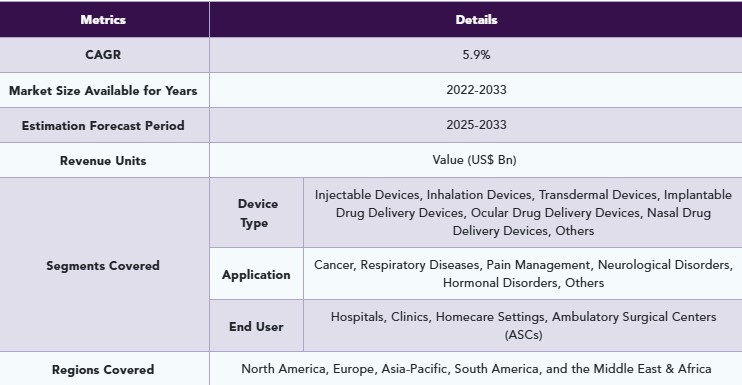 薬剤送達デバイス市場は2024年に904億米ドルに達し、2033年までに1,514億1,000万米ドルに達すると予測されており、2025年から2033年の予測期間中に年平均成長率(CAGR)5.9%で成長する見込みです。