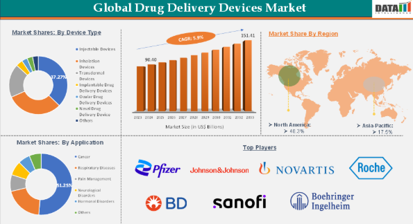 薬剤送達デバイス市場の主要グローバル企業には、Pfizer Inc.、Johnson & Johnson、Novartis AG、F. Hoffmann-La Roche AG、Becton, Dickinson and Company、Sanofi、Boehringer Ingelheim、Merck & Co., Inc.、Boston Scientific Corporation、Teva Pharmaceuticals Industries Ltdなどが含まれる。
