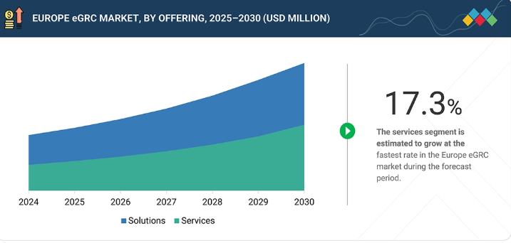 欧州のeGRCソリューション市場では現在、リスク評価とコンプライアンスに焦点を当てた従来型ツールから、高度な人工知能(AI)搭載のクラウドベースガバナンスソリューションへの移行が進んでいます。さらに、機械学習(ML)やAIによる分析技術の進歩、ブロックチェーン技術、IoTベースの運用監視から新たな収益源が生まれるにつれ、多くの業界(例:BFSI、通信、政府、IT・ITeS)の組織が、ポリシーガバナンス、規制適合性、運用レジリエンス、データプライバシーの重要性を強調し始めています。ベンダー各社は、欧州における将来の収益機会を開拓するため、AI対応eGRCソリューションスイート、自動化されたコンプライアンスワークフロー、マネージドサービスへと提供範囲を拡大しています。