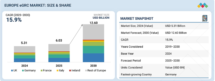 欧州におけるeGRC市場は、2025年の60億3,000万米ドルから2030年までに126億米ドルへ成長し、年平均成長率(CAGR)は15.9%と予測されています。この市場成長は、GDPR、DORA、NIS2、ESG報告といった規制要件に加え、金融サービス、医療、重要インフラ分野における組織固有の要件の進化によるものです。サイバーリスク、業務リスク、第三者リスクの脅威増大に対応するため、組織はクラウドベースのデータ駆動型ガバナンスプラットフォームを導入し、統制とポリシー遵守の可視性を高め、リスク管理を強化しています。リアルタイムリスクインテリジェンス、自動化された監査・証拠ワークフロー、統合型プライバシー・コンプライアンス監視への需要も増加している。さらに、AIを活用した継続的統制監視の導入、中堅企業におけるSaaSファースト型eGRC導入、サードパーティ・サプライチェーンリスクプログラムの拡大、サイバーセキュリティ・業務継続性(オペレーショナルレジリエンス)の成長が市場機会を生み出している。