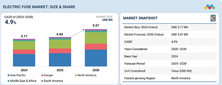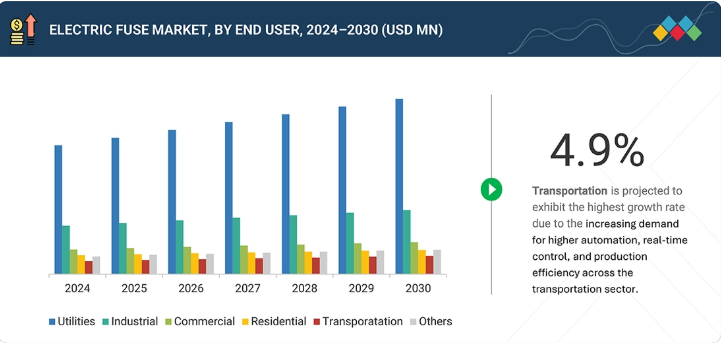 世界の電気ヒューズ市場は、予測期間中に年平均成長率(CAGR)4.9%で成長し、2025年の推定40億米ドルから2030年までに50億7,000万米ドルに達すると予測されている。市場成長は、産業・商業・住宅分野における電化普及の拡大、再生可能エネルギーシステムとスマートグリッドの統合によって牽引されている。安全性と信頼性基準の向上、厳格な電気法規および規制順守要件が、公益事業体や産業オペレーターに先進的なヒューズソリューションの導入を促している。さらに、電流制限ヒューズ、モジュラー設計、デジタル監視技術における進歩が、運用効率、故障保護、システム信頼性を向上させており、重要電力配電ネットワーク全体での市場拡大をさらに後押ししている。