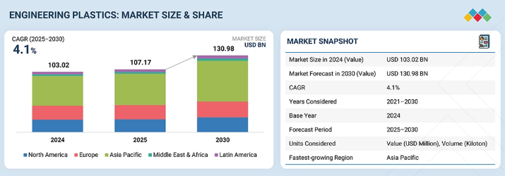 エンジニアリングプラスチック市場は、2025年の1,071億7,000万米ドルから2030年には1,309億8,000万米ドルに達すると予測され、予測期間中の年平均成長率は4.1%。ポリアミド、ポリカーボネート、PEEKなどの高機能エンジニアリングプラスチックは、機械的強度、熱安定性、耐薬品性に優れているため、自動車、電気・電子、家電、工業用途に適しています。自動車産業における軽量、低燃費、耐久性のある部品の需要は、市場成長の主な要因です。さらに、軽量で高性能な材料へのニーズの高まりと、新興国における工業化の進展、高度なポリマー加工技術の採用も市場拡大に寄与しています。さらに、エンジニアリングプラスチック市場の成長は、持続可能で環境に優しい材料を推進する政府のコミットメントによって支えられています。