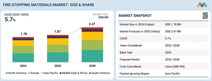 防火材市場は、2025年の18億7,000万米ドルから、2030年までに24億7,000万米ドルに達すると予測されており、2025年から2030年までの年平均成長率(CAGR)は5.7%となる見込みです。防火材市場が拡大しているのは、建設活動の増加や、建物における防火規制の導入によるものです。防火材は、建物の壁や床の開口部を通じた火災、煙、ガスの拡散を防ぐのに役立ちます。受動的防火システムの利用増加やインフラ整備が進んでいます。