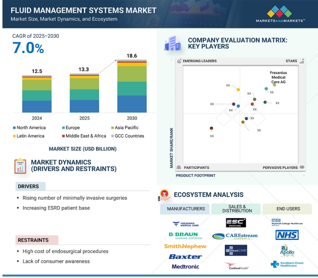 2024年に125億米ドルと評価された世界の流体管理システム市場は、2025年には133億米ドルとなり、2025年から2030年にかけて7.0%の弾力的なCAGRで前進し、期間終了時には186億米ドルの予測評価額に達すると予測されています。体液管理システム市場は、高度な治療ソリューションを必要とする慢性腎臓病、泌尿器疾患、消化器疾患の有病率の増加が原動力となっています。低侵襲手術に対する需要の高まりは、病院インフラへの投資の増加とともに、FMSの世界的な普及をさらに促進しています。さらに、統合システムや自動化システムなどの技術進歩が手術効率と患者の安全性を向上させ、市場成長に寄与しています。しかし、発展途上地域では設備コストが高く、認知度が低いことが大きな課題となっています。