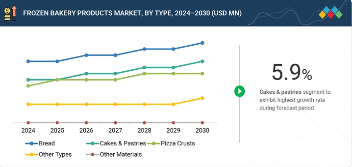 冷凍ベーカリー製品市場、種類別(市場規模および2030年までの予測 – 金額、百万米ドル)