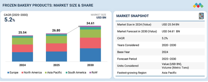 冷凍ベーカリー製品市場は、2024年の255億4,000万米ドルから、2030年までに346億1,000万米ドルに達すると予測されており、2025年から2030年にかけて年平均成長率(CAGR)は約5.2%となる見込みです。市場の成長は、都市化の進展、便利で焼くだけの食品に対する消費者の嗜好の変化、そして近代的な小売および外食産業チャネルの拡大によって支えられています。コールドチェーンインフラの強化や、スーパーマーケット、ハイパーマーケット、クイックサービスレストラン(QSR)における製品の入手可能性の拡大が、市場需要をさらに後押しし続けています。