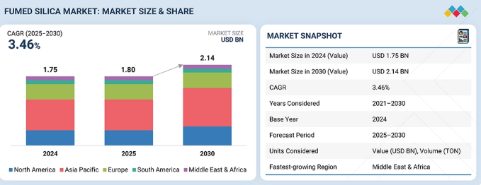 ヒュームドシリカ市場は、2025年の18億米ドルから2030年までに21億4,000万米ドルに達すると予想されており、予測期間中の年平均成長率(CAGR)は3.46%となる見込みです。急速な電動化と電気自動車(EV)の普及拡大は、ヒュームドシリカ市場にとって重要な成長要因となっています。2024年、世界の電気自動車の販売台数は1,700万台を超え、2021年の走行車両台数の2倍以上に達しました。中国が市場を牽引しており、米国や新興国でも着実な成長が見られます(出典:IEA)。この傾向は、高性能材料への需要を後押ししています。なぜなら、ヒュームドシリカは、バッテリー絶縁、熱管理システム、軽量複合材料、構造用接着剤、およびシーラントにおいて、電気自動車の重要な構成要素だからです。一方、都市化の進展と大規模なインフラ開発計画は、建設、塗料、接着剤、シーラント、およびコンクリート分野において、持続的な成長の機会を生み出しています。2016年から2040年にかけての世界のインフラ投資需要は79兆米ドルに達すると予測されており、持続可能な開発と気候変動対策の目標を達成するためには、2030年までに年間約6.9兆米ドルの投資が必要となります。米国、中国、インド、ドイツ、日本などの主要経済圏の政府や産業界は、エネルギー効率に優れ、耐性が高く、高性能な材料の採用をますます進めています。こうした進展により、ヒュームドシリカは、急成長を続ける産業および自動車産業において、材料の性能、耐久性、持続可能性を向上させる汎用性の高い機能性添加剤としての地位を確立しています。