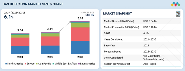 ガス検知市場は、2025年の38億4000万米ドルから2030年までに51億8000万米ドルへ成長し、2025年から2030年までの年間平均成長率(CAGR)は6.1%と予測されている。世界的な安全規制と環境規制の強化により、産業分野では継続的なモニタリングソリューションの導入が迫られており、ガス検知市場の成長が加速している。産業オートメーションとデジタルトランスフォーメーションの推進により、予測分析機能を備えたスマートで接続可能なガス検知システムへの需要が高まっている。さらに、石油・ガス、化学、再生可能エネルギー、高リスク製造業の拡大により操業の複雑化が進み、リアルタイム危険検知の必要性が増している。労働者の安全、ESGコンプライアンス、事故防止への重視の高まりが市場の採用をさらに後押ししている。