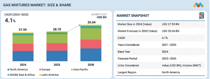 ガス混合物市場は、2025年の287億米ドルから2030年までに350億4,000万米ドルへと成長すると予測されており、この期間の年平均成長率(CAGR)は4.1%となります。ガス混合物の需要は、特殊な産業用途の急速な拡大、厳格な品質・安全基準、および医療、電子機器製造、高度な化学プロセスにおけるこれらの混合物の採用拡大によって牽引されています。