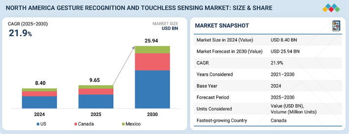 北米のジェスチャー認識および非接触センシング市場は、2025年の96億5000万米ドルから2030年までに259億4000万米ドルに達し、年平均成長率(CAGR)21.9%で成長すると予測される。市場成長は、コネクテッドカー、スマートワークプレイス、デジタル医療システムにおける自然ユーザーインターフェース(NUI)の活用拡大によって支えられている。企業は業務効率の向上と物理インターフェースへの依存度低減のため、非接触技術を導入している。さらに、検知ハードウェアとAIソフトウェアにおける地域的な革新が、様々な産業分野での商用化を加速させている。