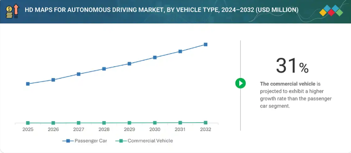 自律走行用HDマップ市場は、乗用車と商用車に区分され、乗用車セグメントは、その台数の多さと中・上級モデルでのADAS使用の増加により、圧倒的なシェアを占めています。