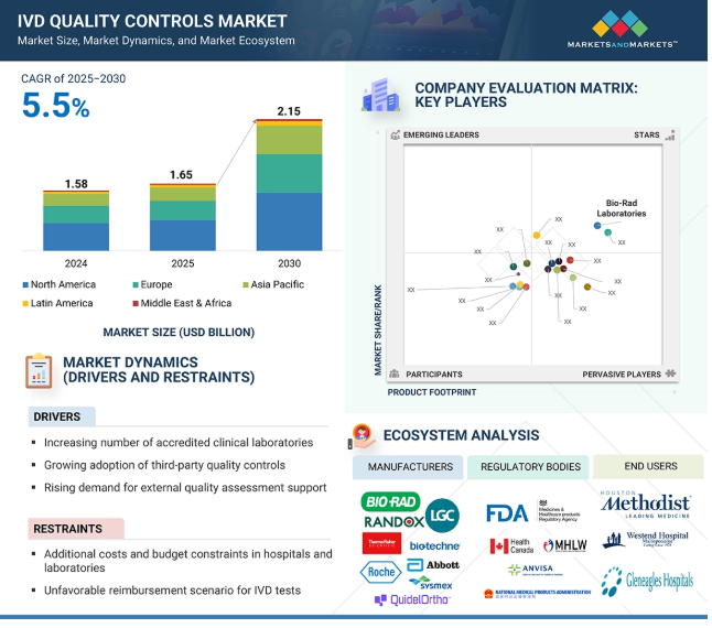 2024年に15.8億米ドルと評価された世界のIVD品質管理市場は、2025年には16.5億米ドルとなり、2025年から2030年にかけて年平均成長率5.5%で堅調に推移し、期間終了時には21.5億米ドルに達すると予測されています。IVD品質管理市場は、いくつかの重要な要因によって大幅な成長を遂げています。認定臨床検査室数の増加が、信頼性が高く標準化された品質管理製品に対する需要を促進しています。さらに、サードパーティ品質管理製品の採用拡大により、検査室は柔軟性、公平な性能評価、プラットフォーム間の幅広い互換性を得ることができます。外部品質評価プログラムに対する需要の高まりは、正確で再現性のある診断結果の必要性をさらに強調しています。高齢者人口の増加などの人口動態の変化により、慢性疾患や感染症の有病率が高まり、診断検査量が増加しています。さらに、先進国地域でのPoC機器の普及は、多様な臨床現場で正確かつタイムリーな結果を保証するための強固な品質管理ソリューションへのさらなる需要を生み出しています。