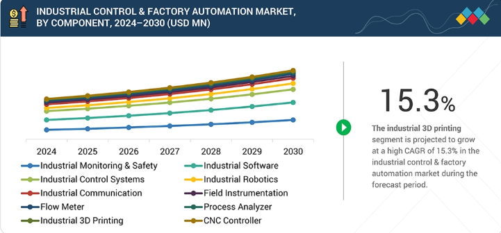 構成要素別では、産業用3Dプリンティング分野が2025年から2030年にかけて産業用制御・工場自動化市場において15.3%の高いCAGRで成長すると予測される。
