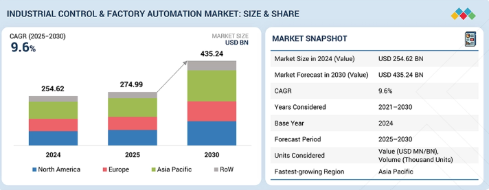 産業用制御・工場自動化市場は、2025年に2,749億9,000万米ドルと推定され、2030年までに年平均成長率(CAGR)9.6%で4,352億4,000万米ドルに達すると予測されています。製造業者が生産ラインを近代化し、スループット、品質、コスト効率を向上させるにつれ、産業用制御・工場自動化市場は拡大しています。産業用ロボット、高度な制御システム、統合産業用ソフトウェアに対する強い需要が、自動車、電子機器、プロセス産業における工場運営を変革している。