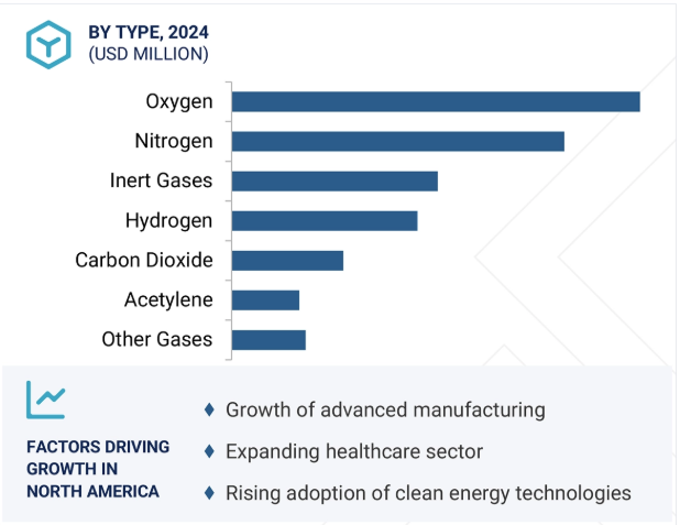 北米は、その充実した産業基盤、技術進歩、多様な最終用途産業により、予測期間中、工業用ガスの最大市場になると予測されています。同地域は、酸素、窒素、水素、二酸化炭素などのガスを大量に消費する製造、化学、ヘルスケア、エネルギー部門が高度に発達しており、人口が多いこともこれらのガスの需要をさらに押し上げています。米国とカナダのヘルスケア産業は医療用ガスのトップ消費者であり、高度な医療インフラと住宅および施設での呼吸器ケアのニーズの高まりの恩恵を受けています。メキシコ湾岸地域では、発展した化学・石油化学セクターの要求が厳しく、加工、精製、特殊化学品の生産に大量の工業用ガスが必要です。北米はクリーンエネルギーへの取り組みでもリードしており、特に水素製造や炭素回収プロジェクトがガス供給源の拡大に寄与しています。食品・飲料業界も、炭酸化、保存、改質雰囲気パッケージング用途の二酸化炭素のようなガスの需要を押し上げています。さらに、継続的なインフラ整備とエネルギー転換および先端製造プロジェクトへの投資により、北米は予測期間を通じて世界の産業ガス市場におけるリーダーシップを維持することができます。